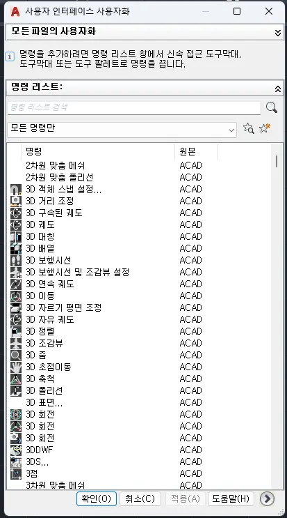 - 명령어 창에서 CUI 입력 후 Enter